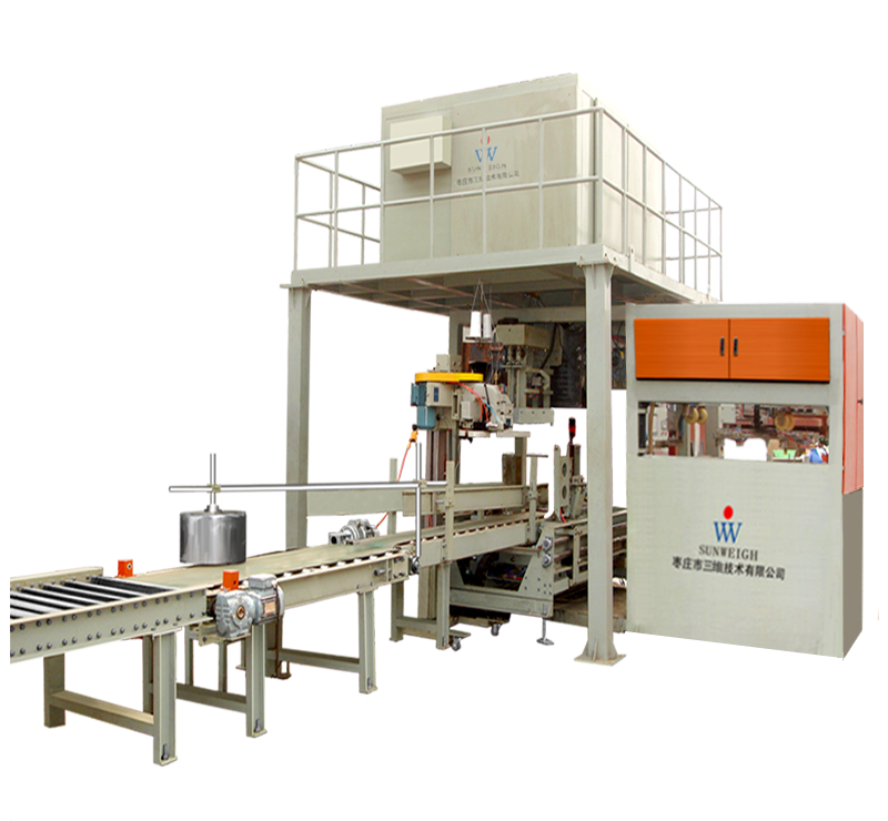 粉劑全自動包裝機型號SW-ABF-800,該款全自動包裝機主要有自動上袋機構、稱重機構、送料機構、機體框架、控制系統、除塵單元、技術檢測單元、折邊縫包機構、輸出機構等組成。自動上袋機構自動將包裝袋碼齊,通過觸手吸盤將包裝袋拾起移動到上袋機構處,上下吸盤將包裝袋打開,上袋機械手將包裝袋夾住,移動機械臂將包裝袋自動套在下料口處,檢測裝置檢測到包裝袋,夾袋夾自動將包裝袋夾緊,稱重機構通過PLC控制系統在接收到套袋完成信息后,自動將稱量好的物料填充到包裝袋內,送料機構繼續對稱量機構送料,同時金屬檢測機構檢測物料中是否存在金屬物質,根據檢測的結果決定是否執行下一個包裝環節,有則自動剔除,沒有則等待完成下一批次的包裝??刂葡到y在接收到物料填充完畢后,等待除塵機構將在包裝過程中造成的粉塵處理掉后,發出信號,夾袋夾將包裝袋放下,抱袋小車將包裝袋移動到折邊機處進行折邊作業,同時縫包機將折好邊的包裝袋自動縫包斷線,完成包裝環節。輸送機將包裝好的包裝袋輸送到拍打機構自動對包裝袋進行整袋作業,等待最后的碼垛作業。