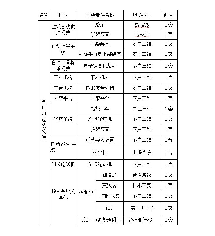 PTA全自動包裝機主要有以下機構構成:定量電子秤、供袋機構、上袋機構、裝袋機構、夾口整形機、收塵機構、折邊縫包系統、倒袋機構組成。詳細配置如下: